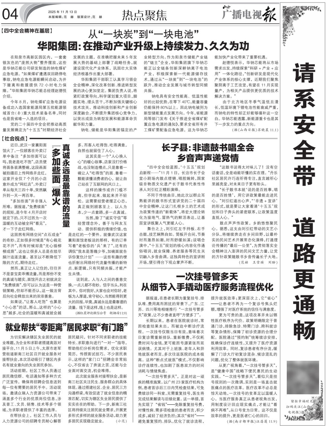 “长子鼓书本就‘说的是百姓事,唱的是百姓情’,用它讲政策最能走进民心。”刘引红道出心声,“‘非遗+宣讲’的形式,就是要让大家看清‘十五五’规划和日子奔头的紧密联系,让政策温度直抵人心。”