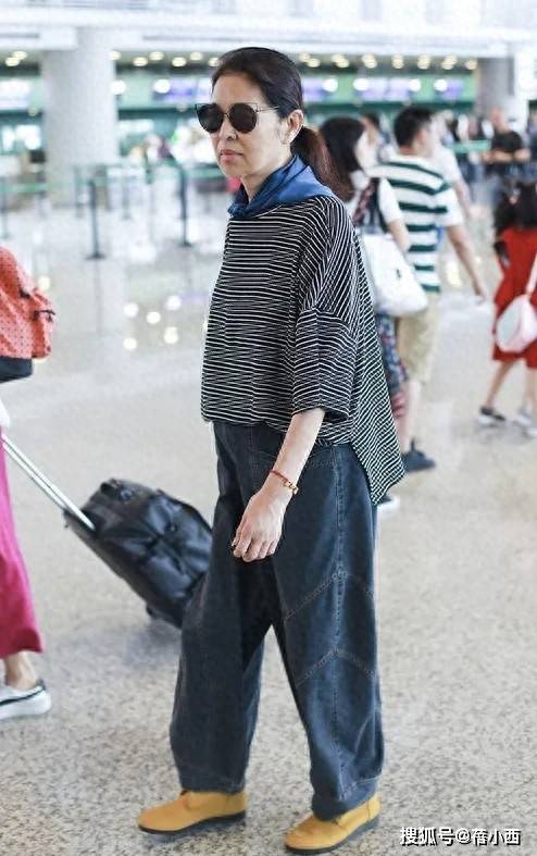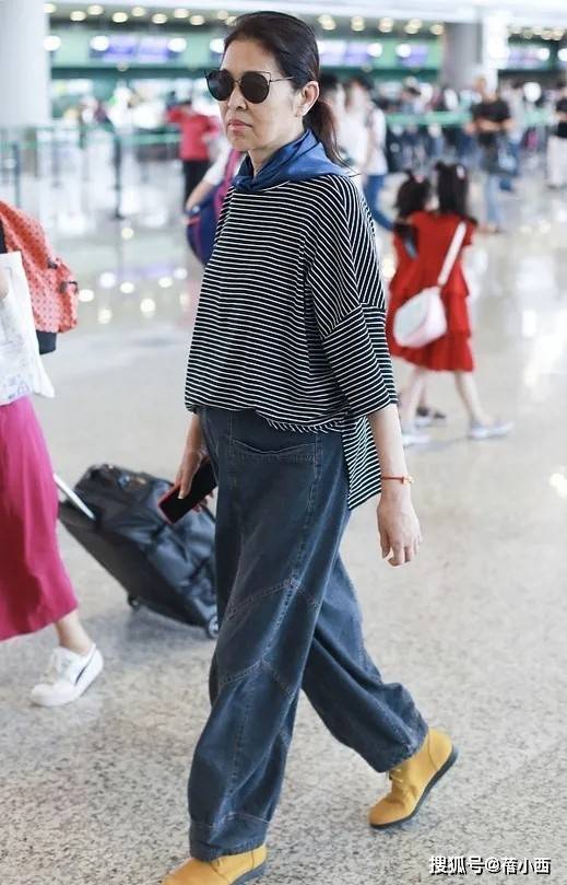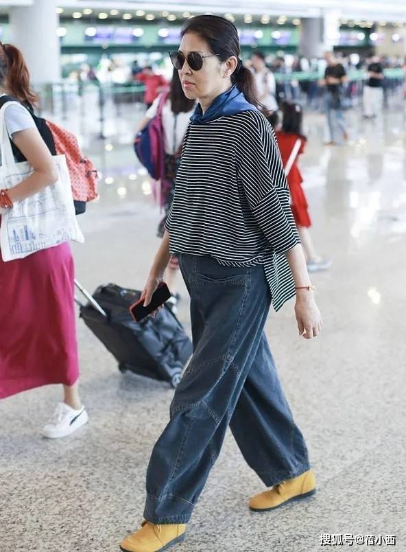 倪萍的这身机场穿搭,堪称中年女性休闲造型的教科书范本。上装选择的条纹T恤看似简约,实则暗藏巧思,宽松的版型完美遮挡住了赘肉,横向条纹虽不及竖条纹显瘦,但恰到好处的剪裁将身形温柔藏于衣料之下,既保留了休闲随性的基调,又避免了拖沓臃肿。色彩上选用经典的黑白条纹,不张扬却自带质感,与她优雅的气气质形成巧妙呼应。